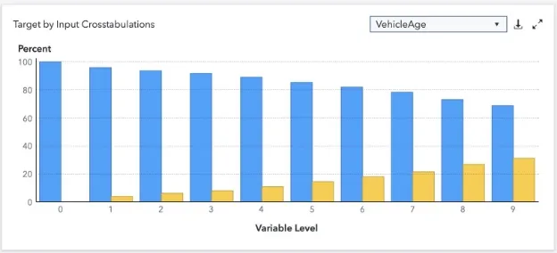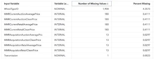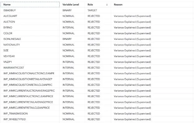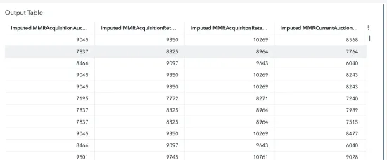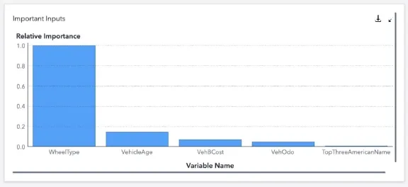 The data exploration node also allowed us to visualize the relationship between the target variable and the input variables. For instance, the correlation between isBadBuy and VehicleAge became apparent, highlighting that older vehicles are more likely to be classified as a bad buy. Consequently, incorporating VehicleAge as an input variable was deemed advantageous for the model training process.