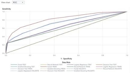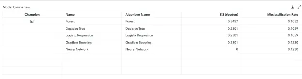 A high KS (Youden) score is important as it shows that the model is distinguishing between classes a lot better. Subsequently, this is also evident by the AUC (area under curve) which would also be the largest for the Forest Algorithm as its KS (Youden) is higher. As can be seen below, the Model Comparison node chose the Forest Algorithm as the champion.
