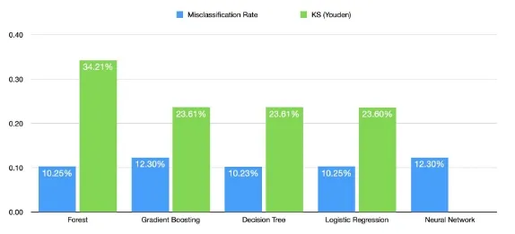 The combination of a high cumulative lift, high KS (Youden), and low misclassification rate suggests that the Random Forest model is robust and valuable for ranking and identifying positive cases, outperforming random or basic approaches. It’s important to note that these metrics indicate the model’s effectiveness in binary classification tasks and its ability to distinguish between classes, making it a strong choice for such tasks.