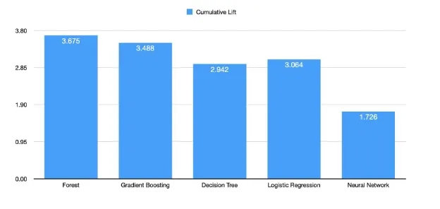 Finally, another reason which outlines the robustness of the random forest is its high cumulative lift which can be seen in the figure below. Cumulative lift, as depicted in the figure below, illustrates the Random Forest’s robustness in improving predictive performance over a baseline model or a random guess. This measure is essential because it demonstrates how much better the model is at identifying positive cases compared to a random selection or a basic model. The Forest Algorithm is 3.675 times better in this case.