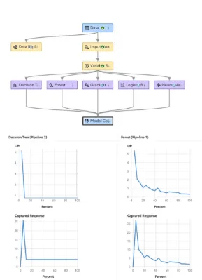 After imputation, the ‘Variable Selection’ node was utilised as it rejected inefficient variables with little potential impact to the models accuracy. The models: Decision Trees, Forest, Gradient Boosting, Logistic Regression, and Neural Networks were then trained using the dataset from this node. These models were selected because to their efficacy in binary classification problems, each of which provides a unique method for differentiating between the two groups. ROC (Receiver Operating Characteristic) curve was used as our evaluation metric due to its ability to effectively measure the performance of binary classifiers, specifically the true positive rate versus its false positive rate. A common challenge all the team members faced during this experiment was with the SAS server. On several occasions, there were issues with data not loading properly. Additionally, the project pipeline that was saves on the exchange and on the personal accounts were inadvertently deleted due to server hiccups.